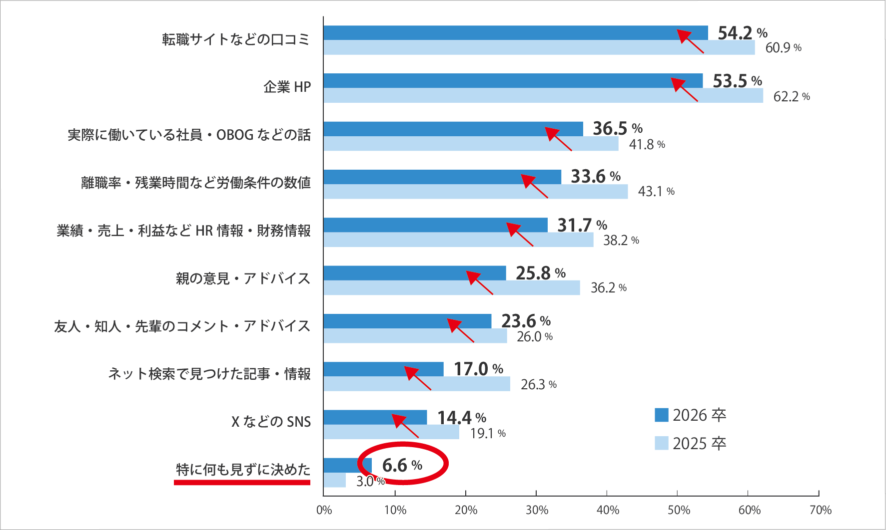 学生のファーストキャリア決定のプロセスが、以前よりも軽くなっているのかもしれません。企業の情報発信の質が落ちたわけでも、大学のキャリア支援が手薄になったわけでもありませんが、弊社の調査データ『新卒採用戦線 総括2026』(※1)からは、入社の決定プロセスがどこか淡白で、カジュアルなものになっている様子がうかがえます。