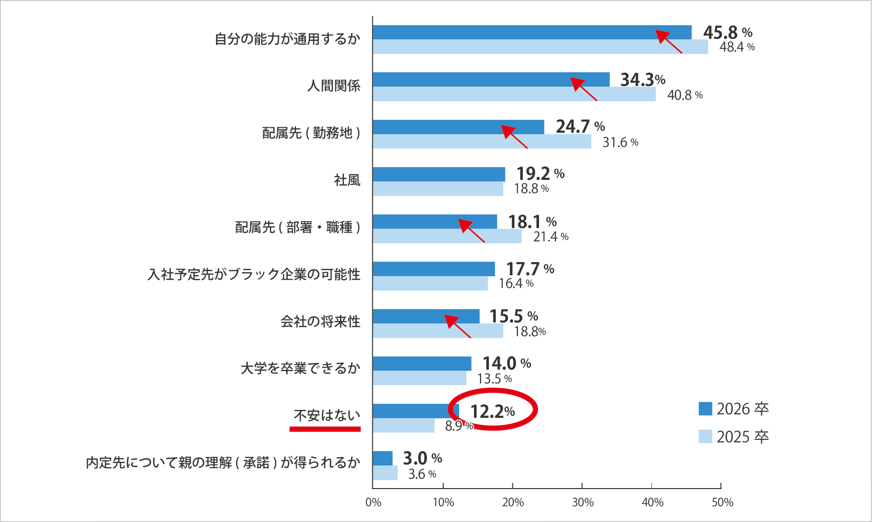 「自分の能力が通用するか」(45.8%)、「人間関係」(34.3%)、「配属先(勤務地)」(24.7%)と、上位3つはすべて前年より下回りました。他にも「配属先(部署・職種)」(18.1%)、「会社の将来」(15.5%)は前年よりダウンしています。そのなかで目立って前年比アップしているのが「不安はない」で、8.9%から12.2%と数字を伸ばしています。少ない情報で意思決定する学生は増えているのに、不安を感じている学生は減っていることが分かります。