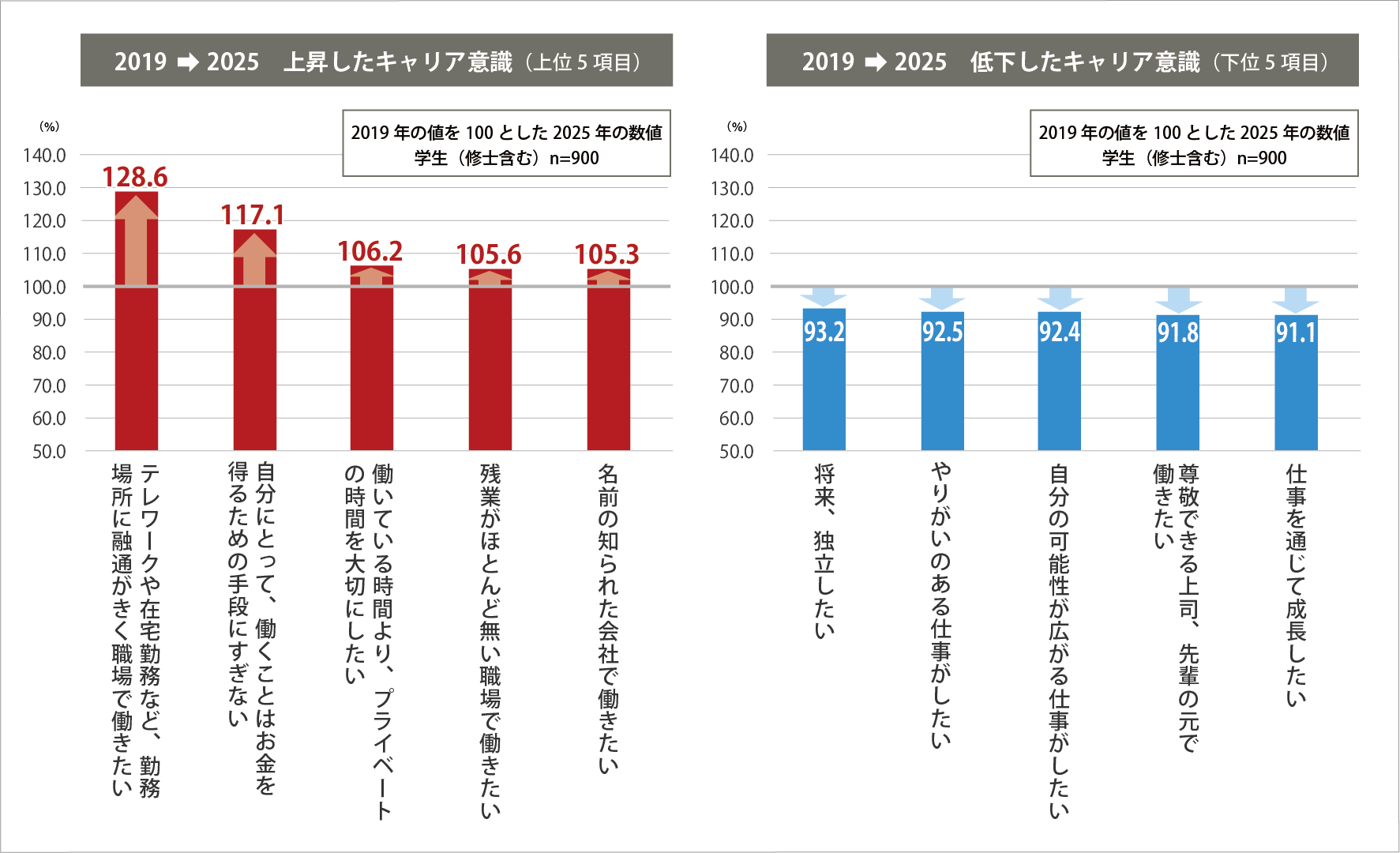 また、仕事への熱量低下も要因の1つでしょう。パーソル総合研究所の『新卒就活の変化に関する定量調査』(※2)では、2019年と2025年のキャリア意識の変化を紹介しています。その結果をご覧ください。